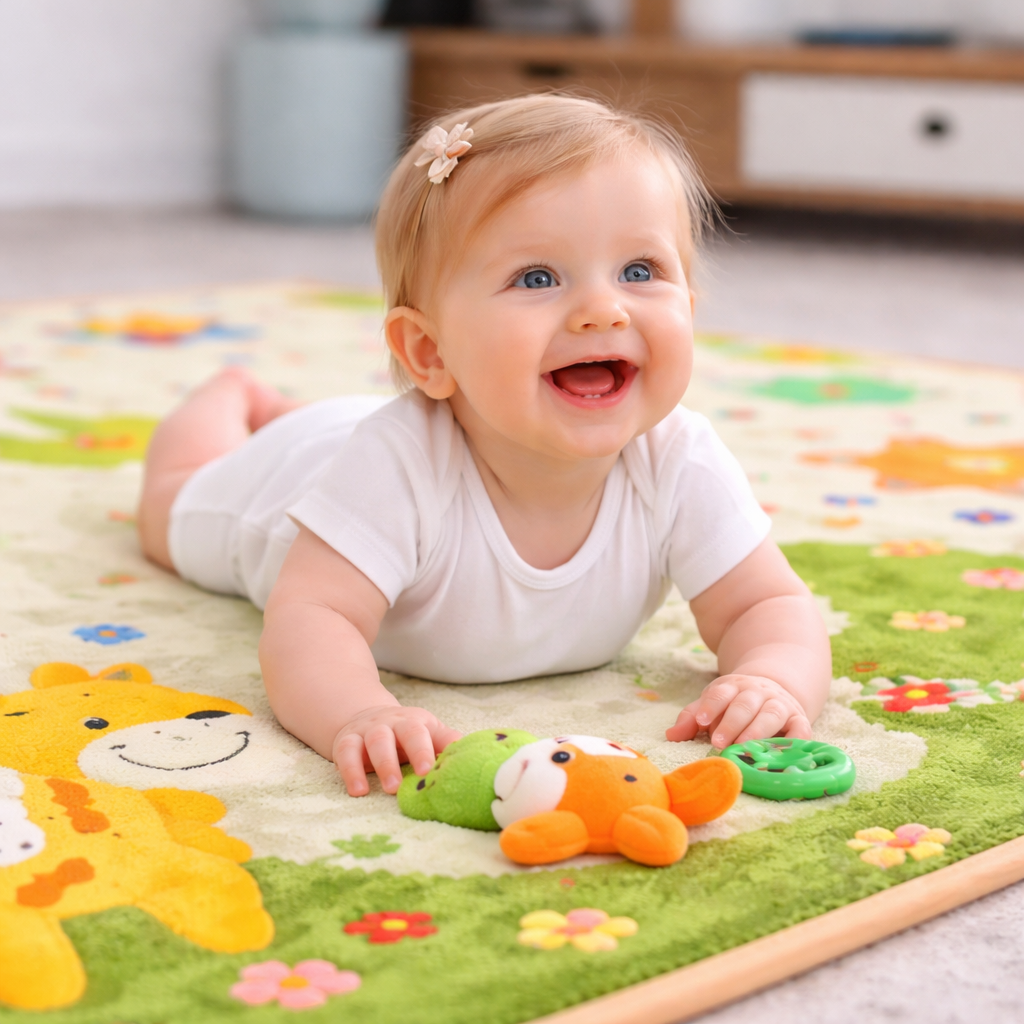 Sí. La alfombra está fabricada con materiales seguros y libres de tóxicos, y cuenta con un acolchado suave que protege a tu bebé mientras juega, está boca abajo o empieza a moverse.