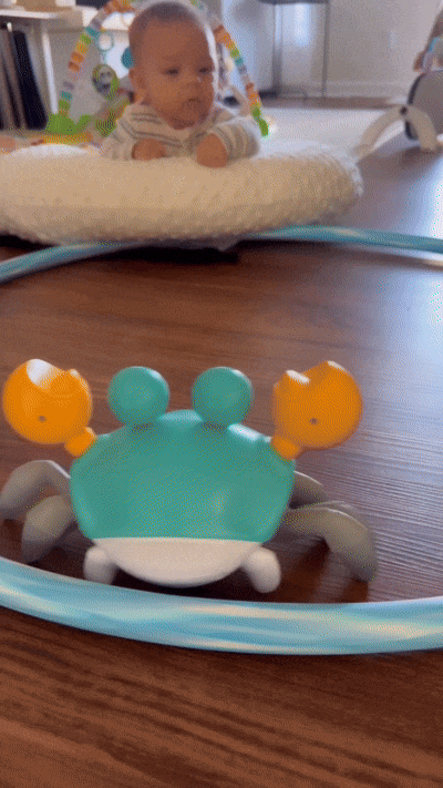 Cada movimiento que el bebé hace al intentar seguir al cangrejo ayuda a fortalecer músculos, mejorar la coordinación y estimular la atención visual.
