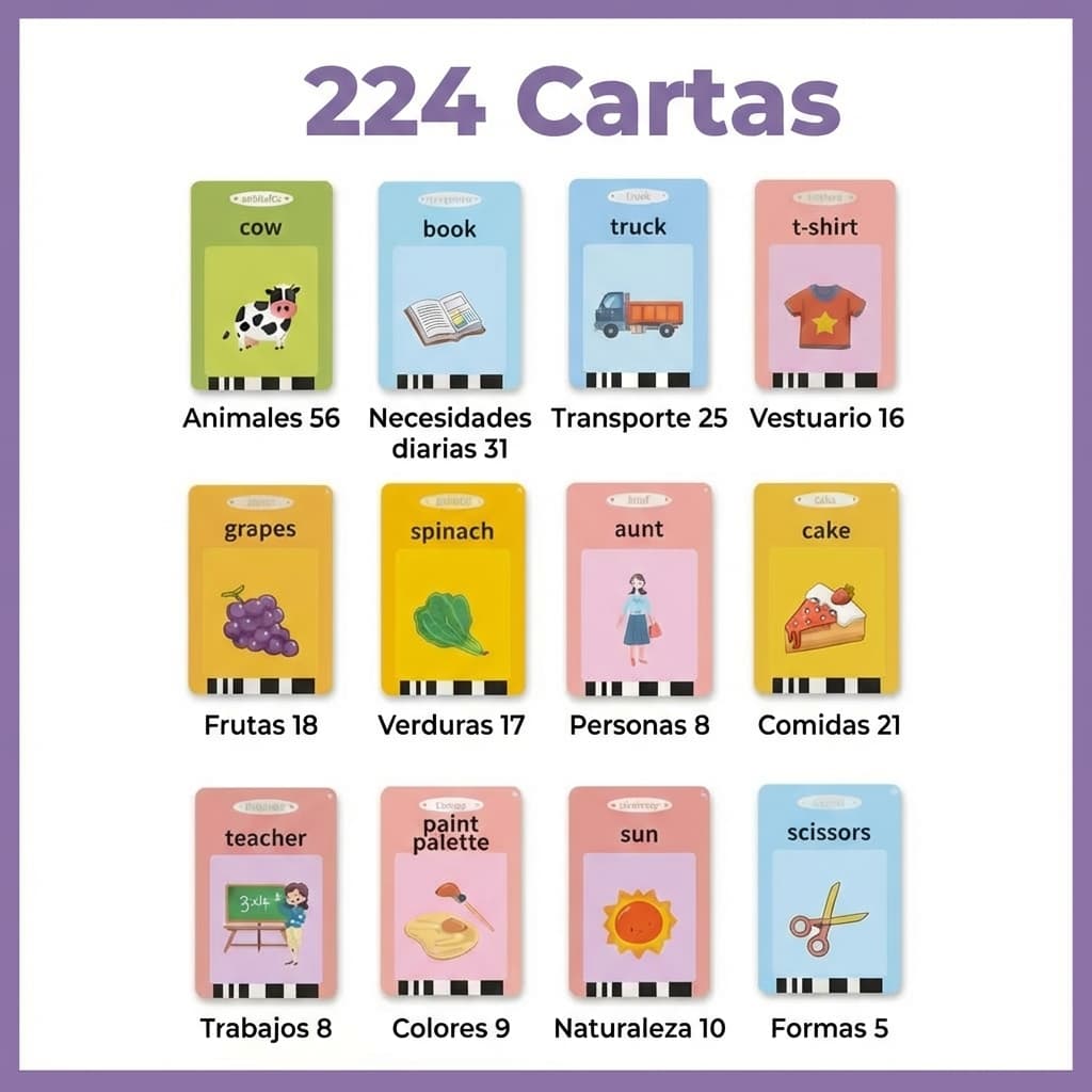 Nunca le enseñamos inglés de forma directa. Jugando con las tarjetas empezó a decir colores y animales en inglés antes que en español. Ahora es su juguete favorito. — Sandra L.